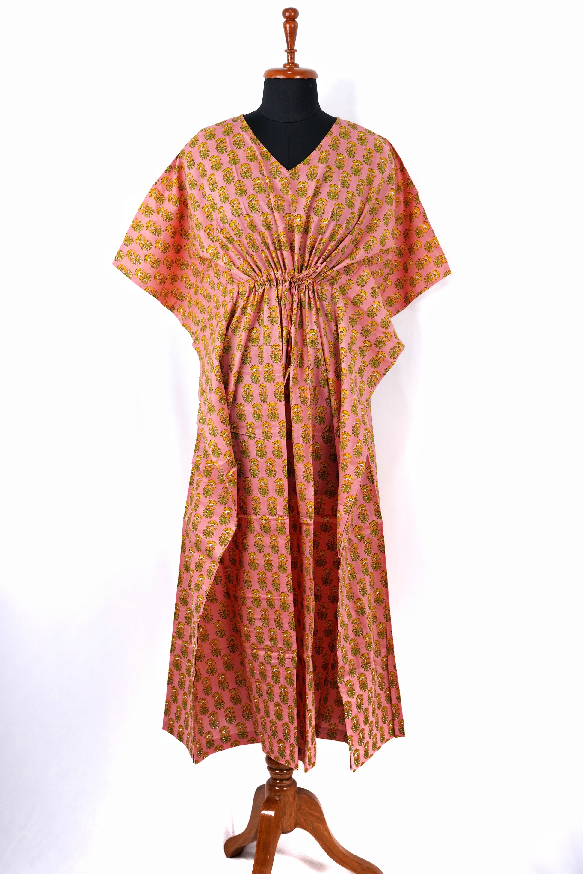 Feel comfortable in our elegant breezy cotton printed long kaftan – Free in size, Easy to Wear, Comfortable best to look effortlessly. The long kaftans have a drawstring at the waist and side slit for easy movement.