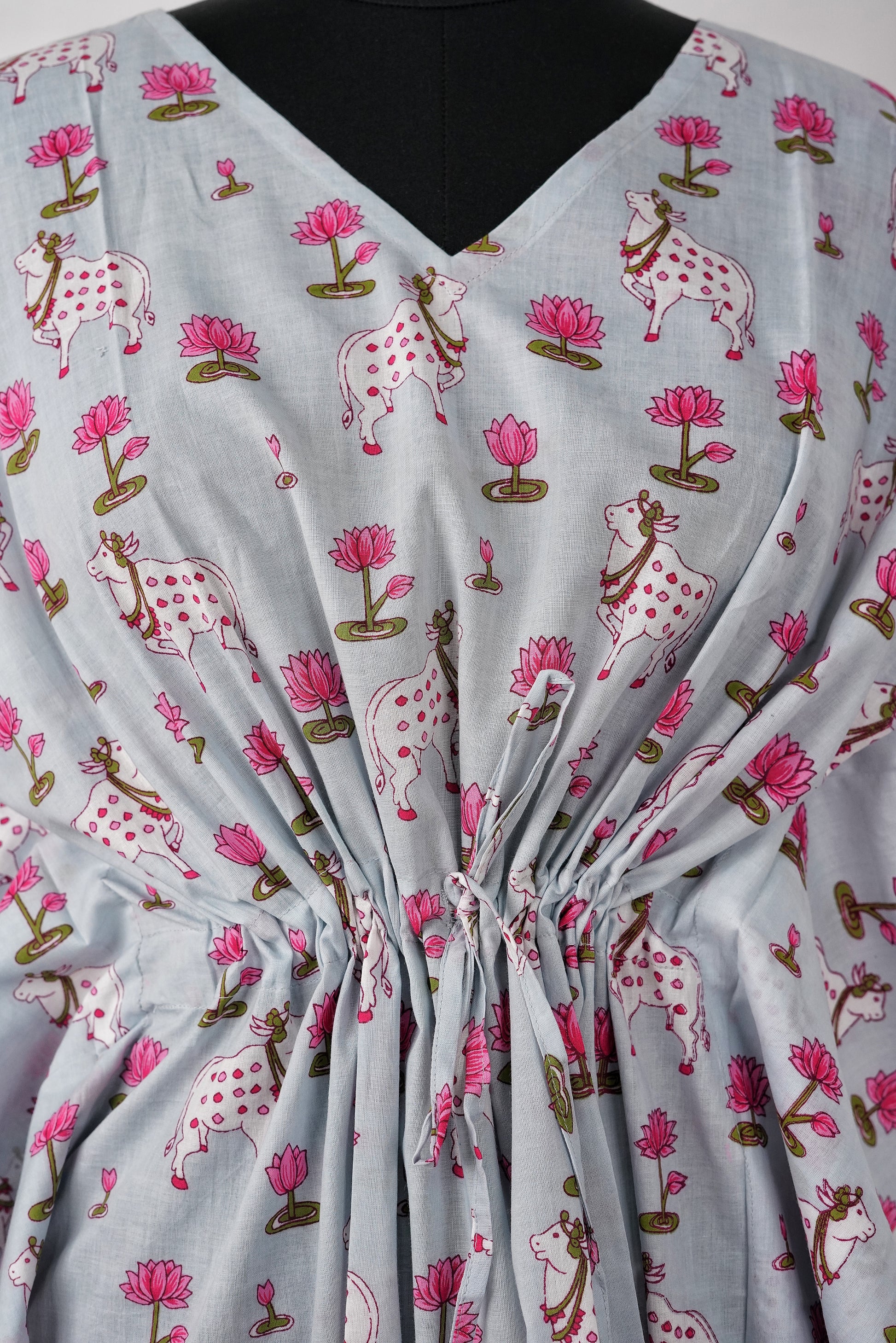 Feel comfortable in our elegant breezy cotton printed long kaftan – Free in size, Easy to Wear, Comfortable best to look effortlessly. The long kaftans have a drawstring at the waist and side slit for easy movement.