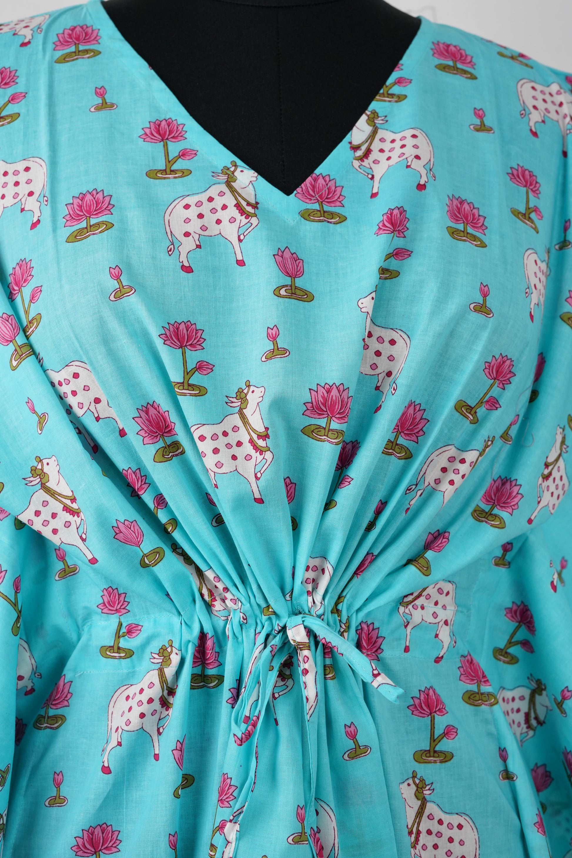 Feel comfortable in our elegant breezy cotton printed long kaftan – Free in size, Easy to Wear, Comfortable best to look effortlessly. The long kaftans have a drawstring at the waist and side slit for easy movement.